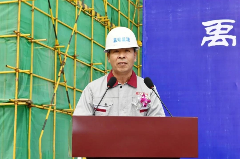 監(jiān)理單位代表和施工方代表分別作了發(fā)言。劉安民宣布主體正式封頂。