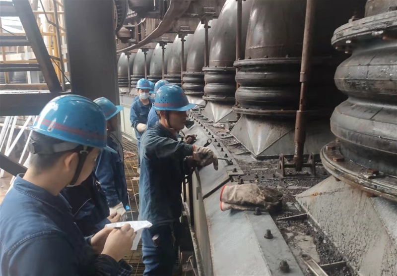 圖二:高爐崗位職工在對(duì)爐頂?shù)臍饷芟、儀表儀器等關(guān)鍵生產(chǎn)設(shè)備進(jìn)行檢查,做好精密儀器的防潮、防雨工作,確保生產(chǎn)系統(tǒng)穩(wěn)定順行。
